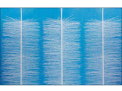 彈性填料篩選用聚烯烴類和聚酰胺中的幾種耐腐、耐溫、耐老化的品種,混合以親水、吸附、抗熱氧等助劑,采用特殊的拉絲、絲條制毛工藝,將絲條穿插同著在耐腐、高強(qiáng)度的中心繩上。由于選材和工藝配方精良,剛?cè)徇m度,使絲條呈立體均勻排列輻射狀態(tài),制成了懸掛式立體彈性填料的單體。填料在有效區(qū)域內(nèi)能立體全方位均勻舒展?jié)M布,使氣、水、生物膜得到充分混滲接觸交換,生物膜不僅能均勻地著床在每一根絲條上,保持良好的活性和空隙可變性,而且能在運(yùn)行過程中獲得大的比表面積。